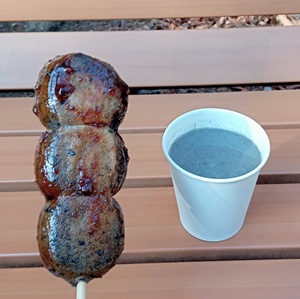 今回は江戸くるみ味噌団子と黒ごま甘酒をいただきました。お団子は焼いてあるのでカリッとしていて、ごまと甘めのくるみ味噌がとても風味があり美味しいです。黒ごま甘酒も冷えた体には大変ありがたいです。味は甘過ぎず黒ごまがいっぱいなのでいかにも体に良いという感じで美味しいです。お団子も甘酒も五臓六腑に染みわたりました(笑)。
